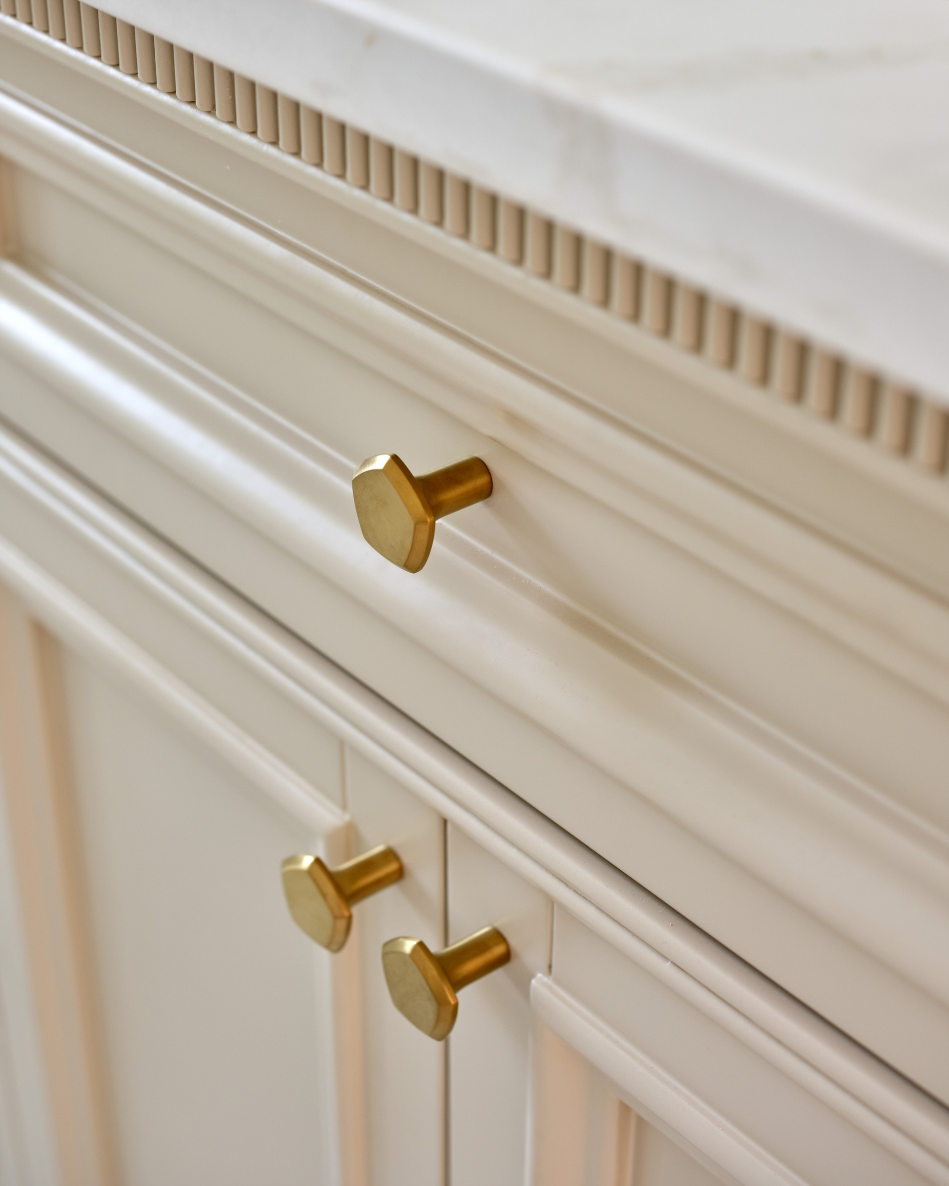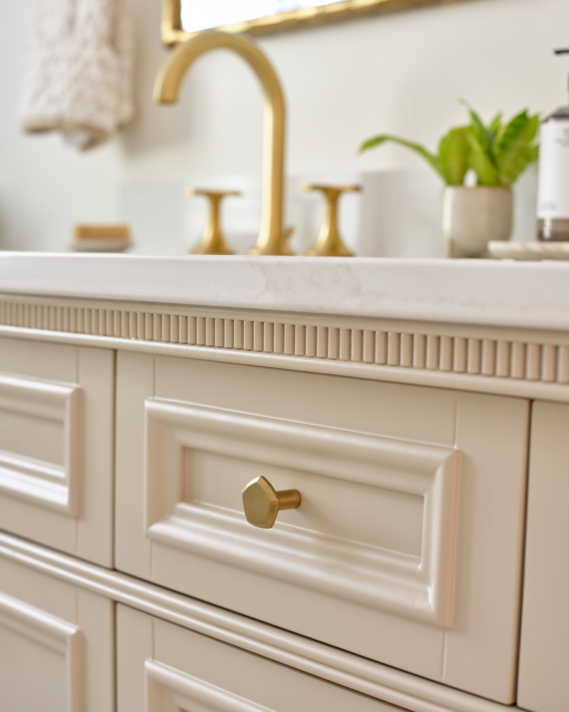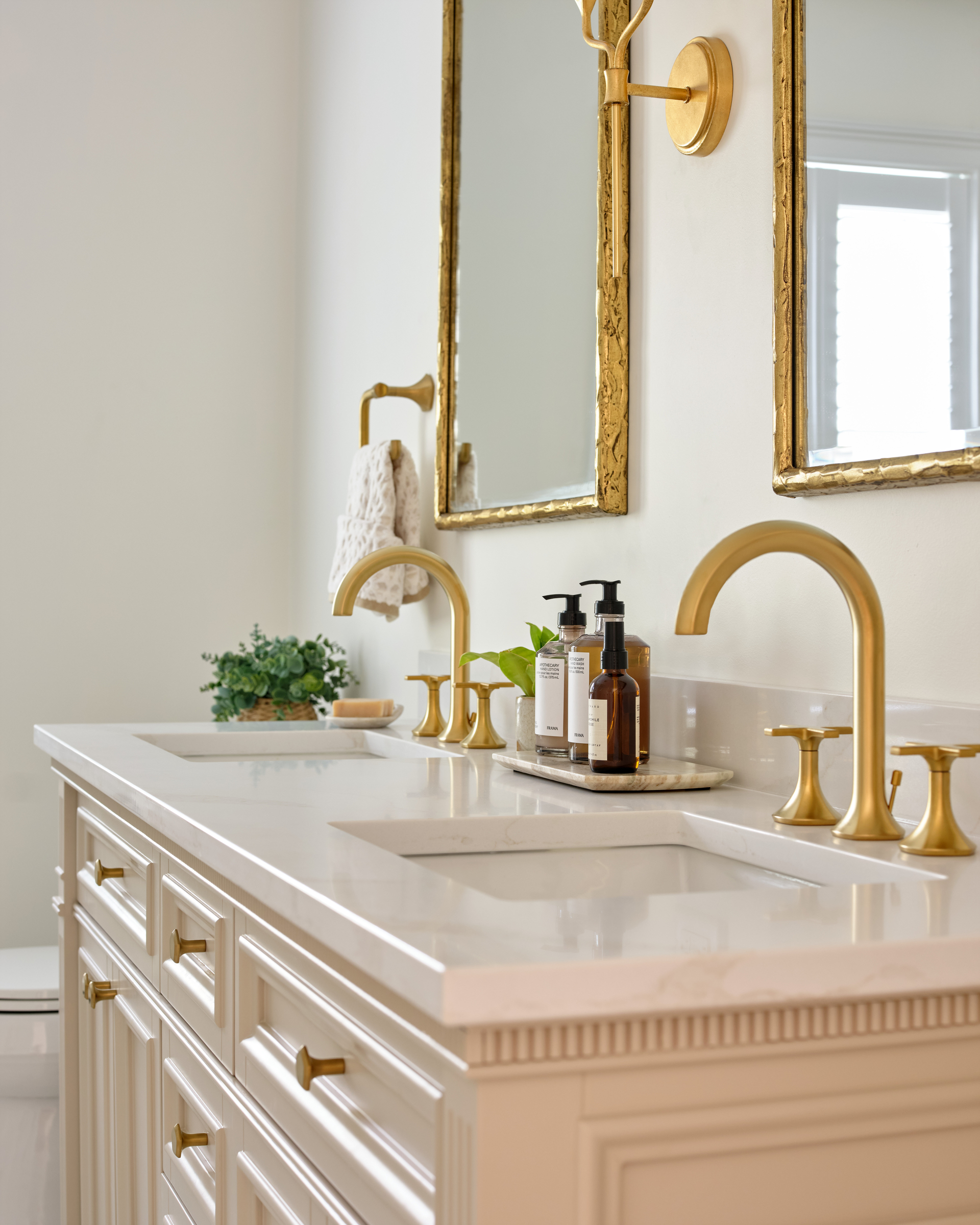 - Warm Kohler plumbing details in Vibrant Brushed Modern Brass